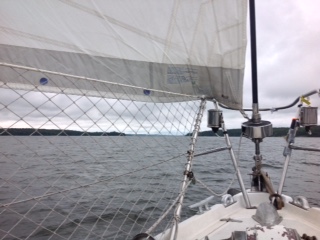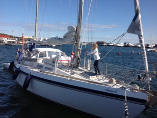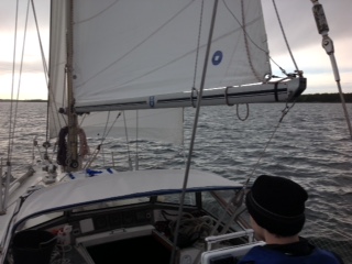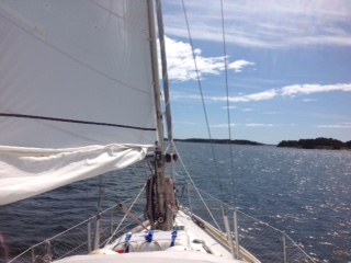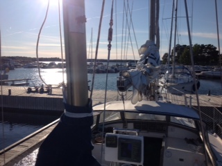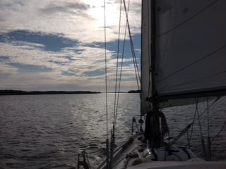 2015-06-03 15:41:32 Tuuli oli aamulla aika kova, mutta tankkasimme diseliä ja tyhjensimme septitankin ennen kuin lähdimme liikkeelle. Tuuli oli kuitenkin sen verran kova että vastatuuleen koneella ajo ei kiinnostanut joten teimme u-käännöksen ja ajamme nyt kohti kuharantaa. Avasimme keulapurjetta pari metriä ja kuljemme nyt pelkällä keulapurjeen kulmalla 6 solmua. 59n59.4 22e44.7