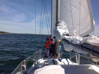 2015-06-11 14:08:11 Akimoto ei toimi, mutta Arska toimii ja ajaa nyt meitä pelkällä keulapurjeella myötätuuleen. Miehistö tarkistaa keulakantta. 59n59.3 22e43.8