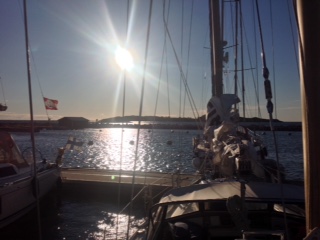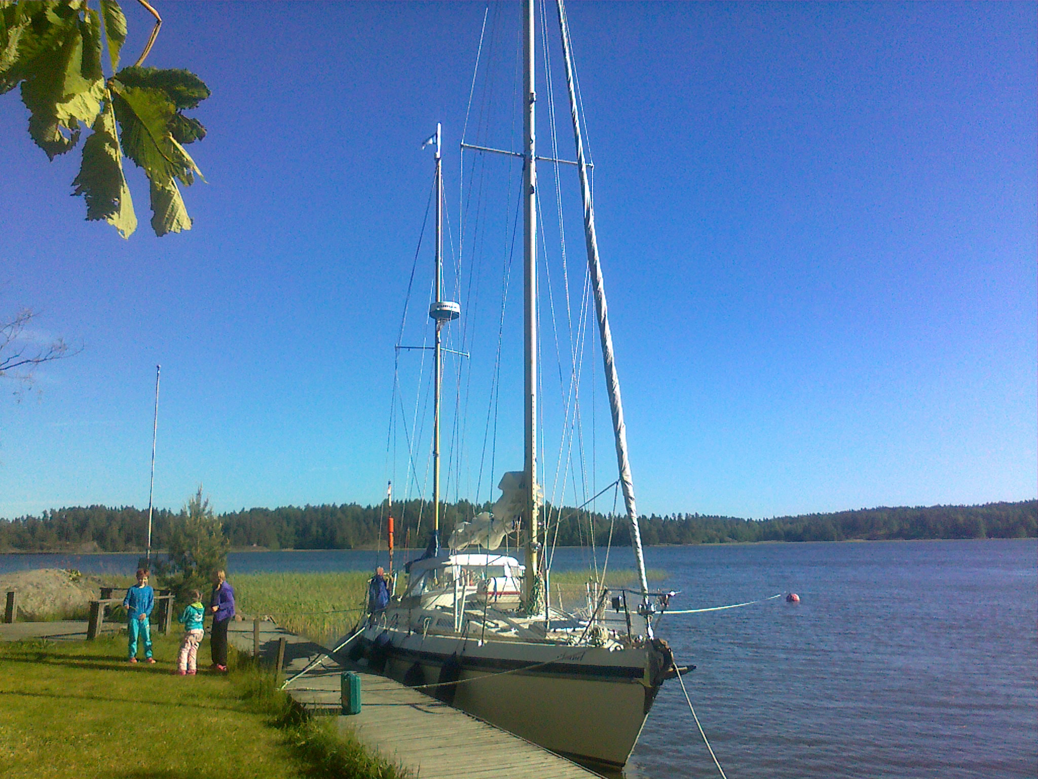 2015-06-15 20:57:23 Perillä Jurmossa. Tänään tulimme aika kovaa purjeilla, logi sanoo max speediksi 9.16 kn, mutta itse näin vain jotain 7+ lukuja sogissa. Jurmo on aika tyhjä, täällä on vain neljä venettä ja kuusi mastoa. Rantautuminen ei mennyt ihan niin kuin oli ohjeistettu, kun olin suurinpiirtein valmiina ajamaan poijulle huomasin että kaksi kansihenkilöäni sähläävät vielä lepuuttajien kanssa, poijukoukkua ei ole otettu valmiiksi, keulaköysi ei ole valmis, jollan köysiä ei ole lyhennetty, joten pikainen uuppari ja pari minuuttua myöhemmin uusi yritys. 59n49.7 21e35.1