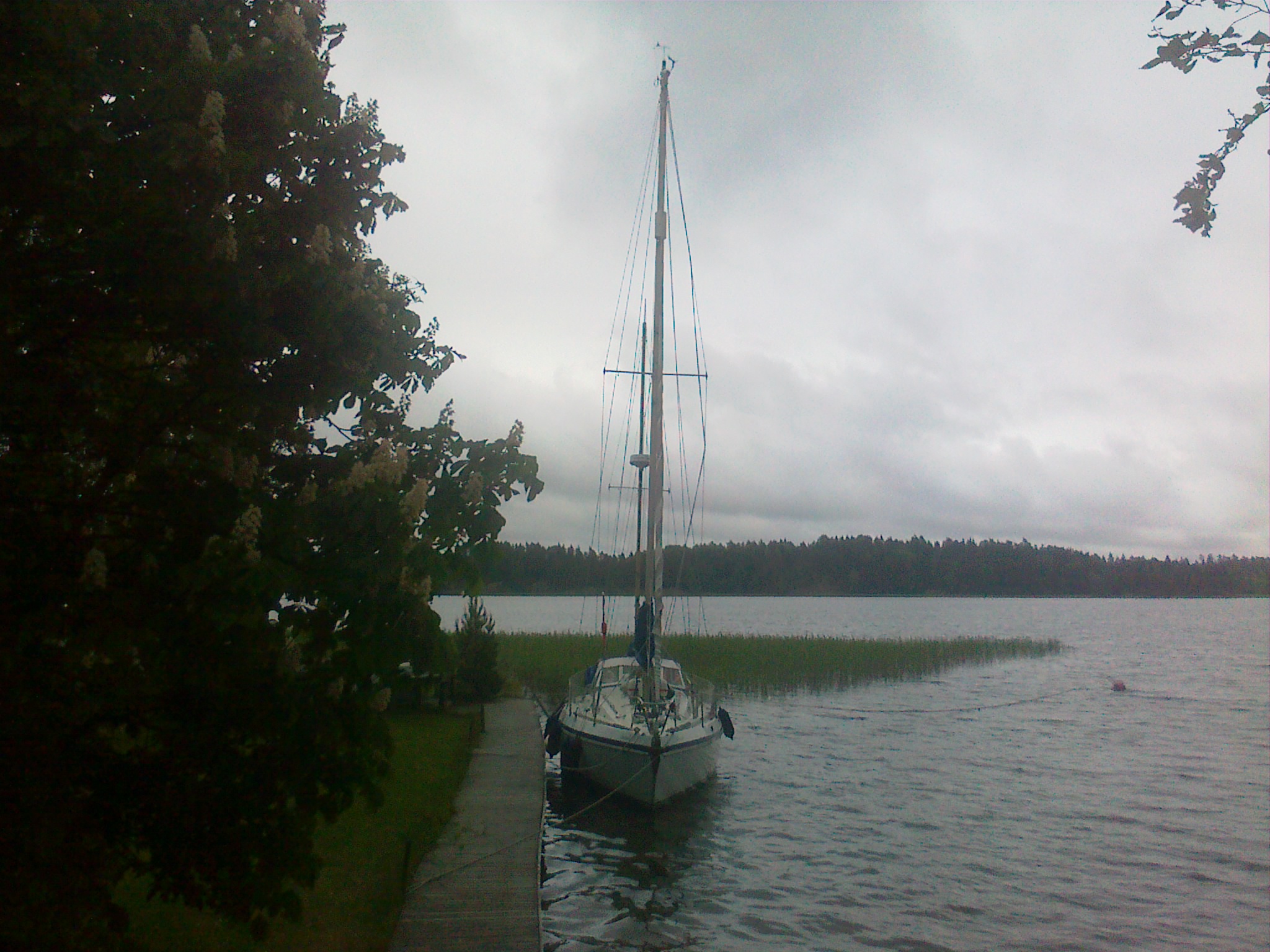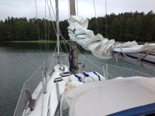 2015-06-18 18:53:32 Aamulla satoi joten lähdimme myöhään liikkeelle (sateessa). Lähdössä poijukoukku jumitti poijuun kiinni ja sen irrottamista varten piti ottaa työkalut esiin ja mennä jollalla poijulle vääntämään koukkua. Lopulta se oli irti ja pääsimme irti perästä ja sitten keulaköysi jumitti laiturin lautojen väliin. Naapurin pikaisella avustuksella pääsimme vihdoin liikkeelle. Poijukoukun alaosan lukitustangon hahlo oli taas puristunut kasaan ja sen takia lukitustanko oli jumittanut kiinni asentoon. Saimme sen ruuvimeisselin avulla korjattua. Nyt lähestymme jo Kuharantaa purjeilla. 60n02.0 22e55.0