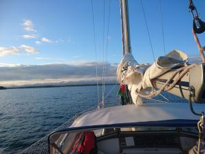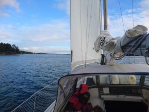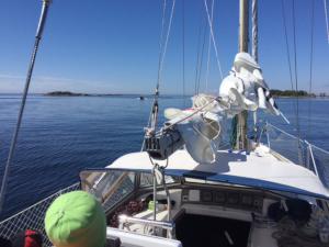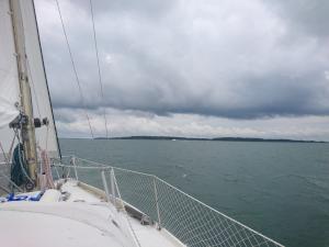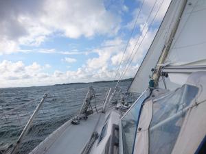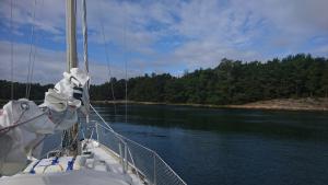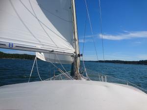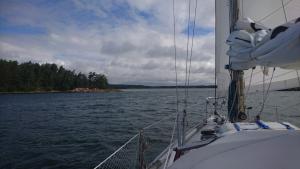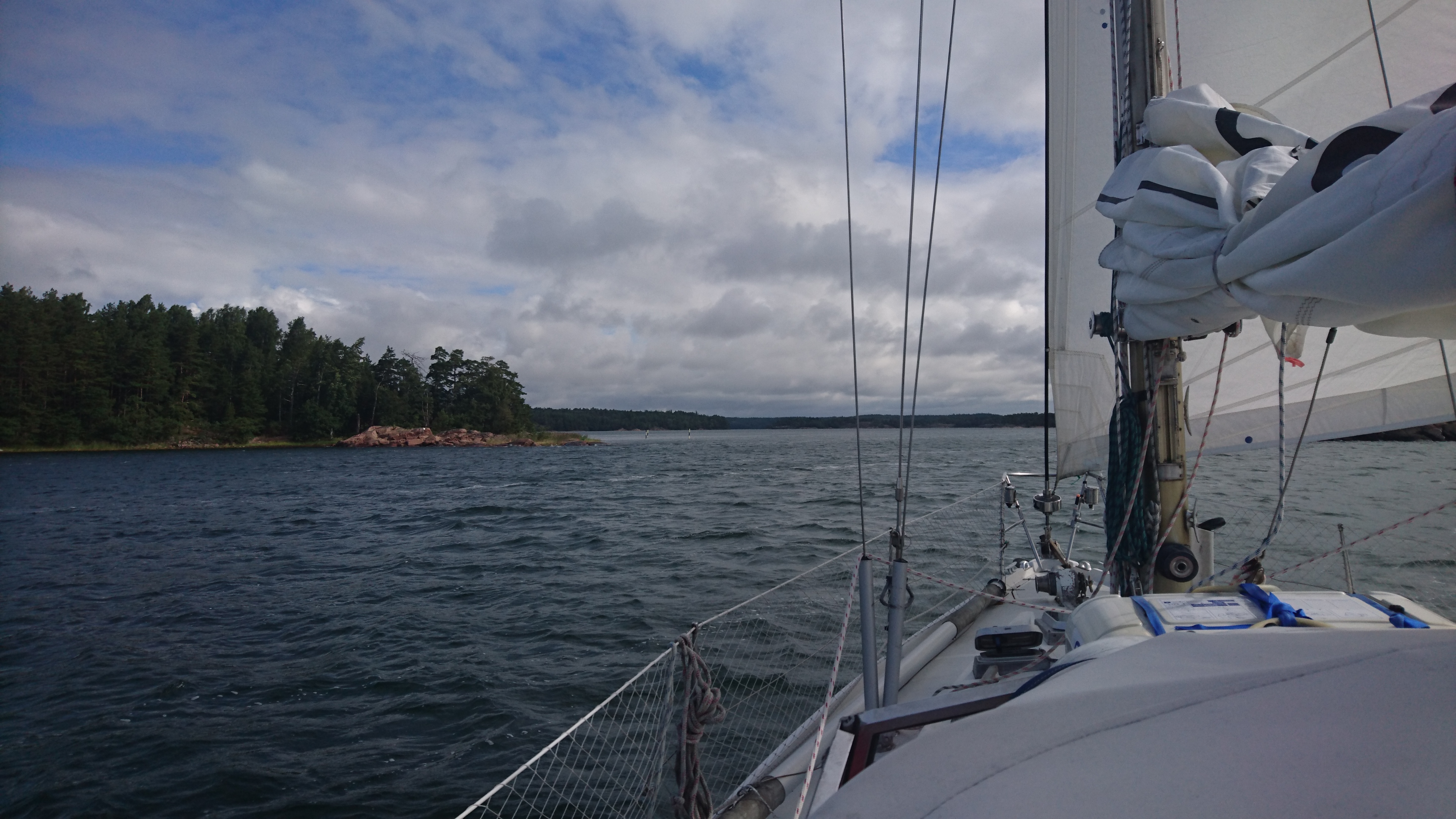 2017-08-06 14:56:18 Matkalla kohti paraistenporttia. Vauhtia 6-7 solmua, tuuli sivulta 9m/s, eli vene kulkee kivasti. Edessä näkyy muutama tumma pilvi. 60n20.4 21e50.1