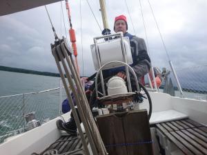 2017-08-04 17:07:01 Nyt tuli aurinkokin näkyviin. Vauhtia on 7 solmua ja tuuli on sivulta 9-13 m/s. 60n05.8 22e19.8